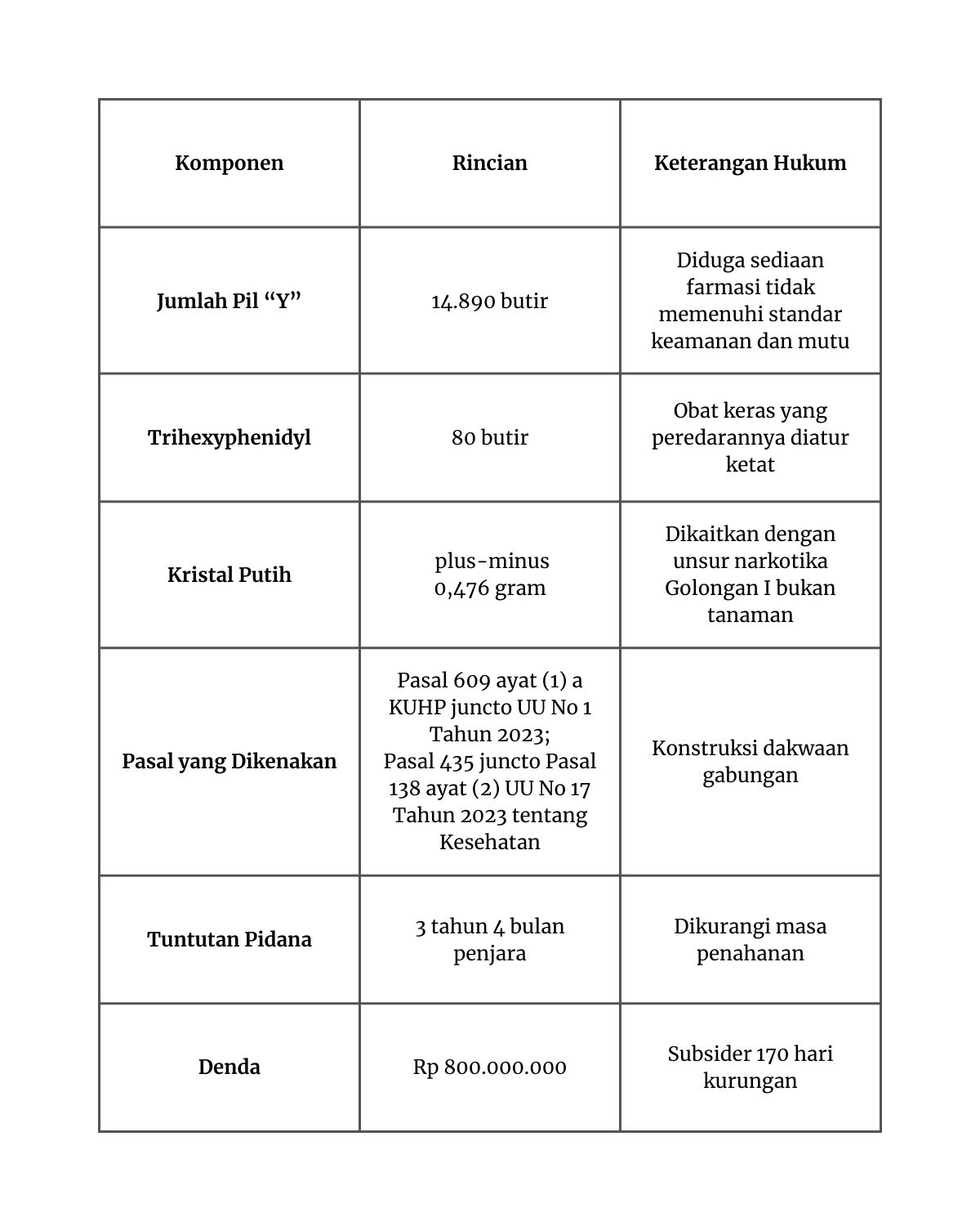 Sebagai bagian dari liputan berbasis data The Nurak News pada rubrik Hukum – Peradilan dan Putusan, berikut adalah ringkasan terstruktur yang memetakan hubungan antara jumlah barang bukti, pasal yang dikenakan, dan tuntutan pidana. Penyajian ini bertujuan memberi konteks kuantitatif agar publik dapat menilai sendiri sejauh mana tuntutan dianggap ringan atau sebaliknya.